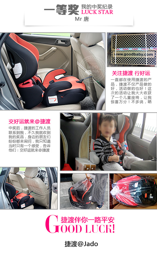 一等獎30名,獎品為價值1500多元的好孩子兒童安全坐椅,孩子是未來,是希望,捷渡與您一同關(guān)心您的寶貝,一等獎的客戶拿到獎品后,都十分高興,給我們發(fā)來信息說,捷渡想到的太周全,太有愛啦!