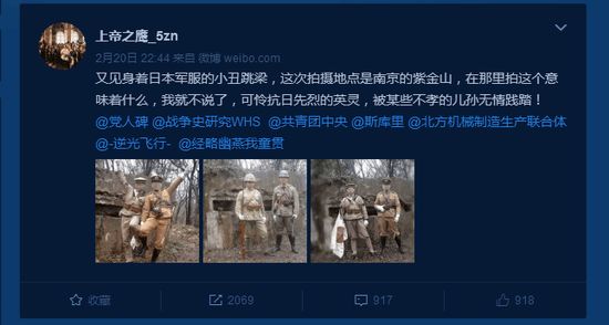 近日,有兩名青年身穿侵華日軍軍裝在南京紫金山抗戰(zhàn)遺址留影,并上傳網(wǎng)絡(luò)。2月20日,大年初五,網(wǎng)友@上帝之鷹_5zn 在微博發(fā)出了一組照片揭露此事。