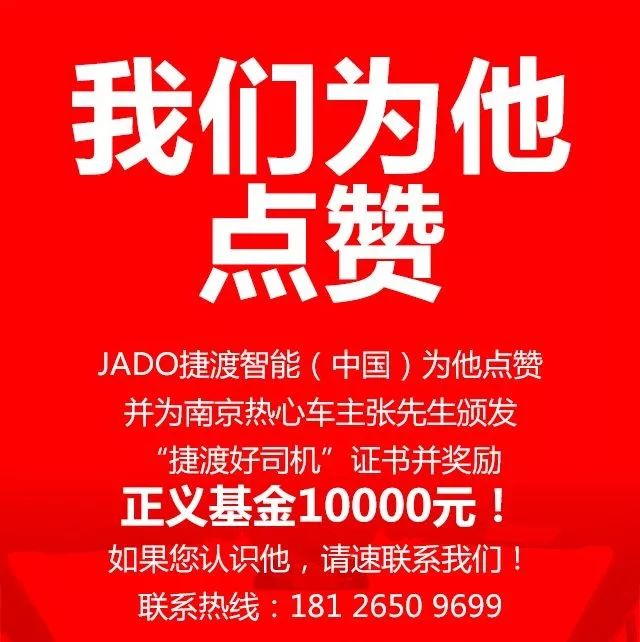 JADO捷渡智能(中國(guó))為提供證據(jù)的張先生點(diǎn)贊,為他的中國(guó)心、正義感點(diǎn)贊!同時(shí)將為張先生頒布“捷渡好司機(jī)”證書(shū),并獎(jiǎng)勵(lì)正義基金1萬(wàn)元!