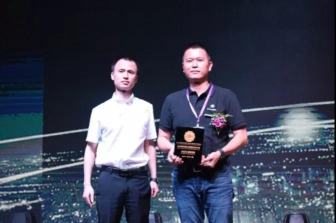 接下來是大會的頒獎環節,由廣匯集團集采總經理 何思先生為JADO捷渡智能(中國)頒發了“2018年度中國4S店集團杰出合作獎” 獎項,JADO捷渡智能(中國)總經理陳問文先生代表JADO捷渡智能(中國)上臺領獎。