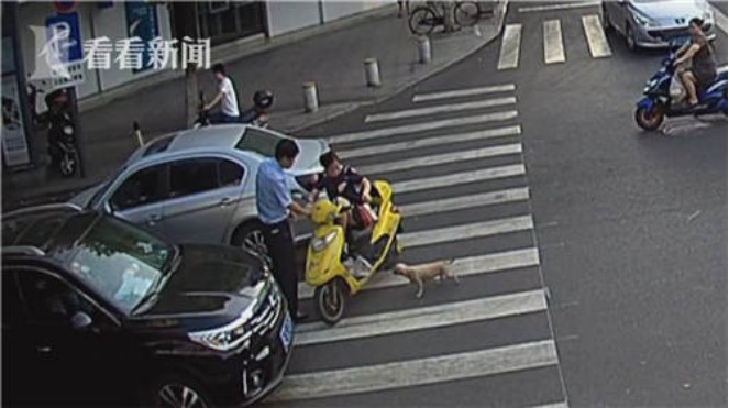 就這樣,因為一條小狗的追逐,就接連發生了兩起事故,而張女士之所以這么怕狗,也是有原因的。當時張女士剛剛從菜場買了一只鹽水鵝出來,這條小狗可能是被肉的香味所吸引,追著不放。“出來的時候就一直被一只狗追。因為我是孕婦,我就怕被狗咬了以后不好。”驚慌之下,張女士才騎出幾十米就出了事故。