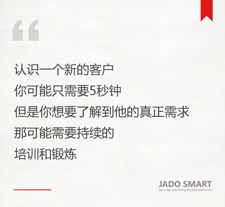 怎樣了解客戶的真實需求?從而讓客戶主動接受你推薦的產品。2018年9月5日,帶著這些疑惑和思考,JADO捷渡智能(中國)4S集團交流培訓會在期待中拉開帷幕。